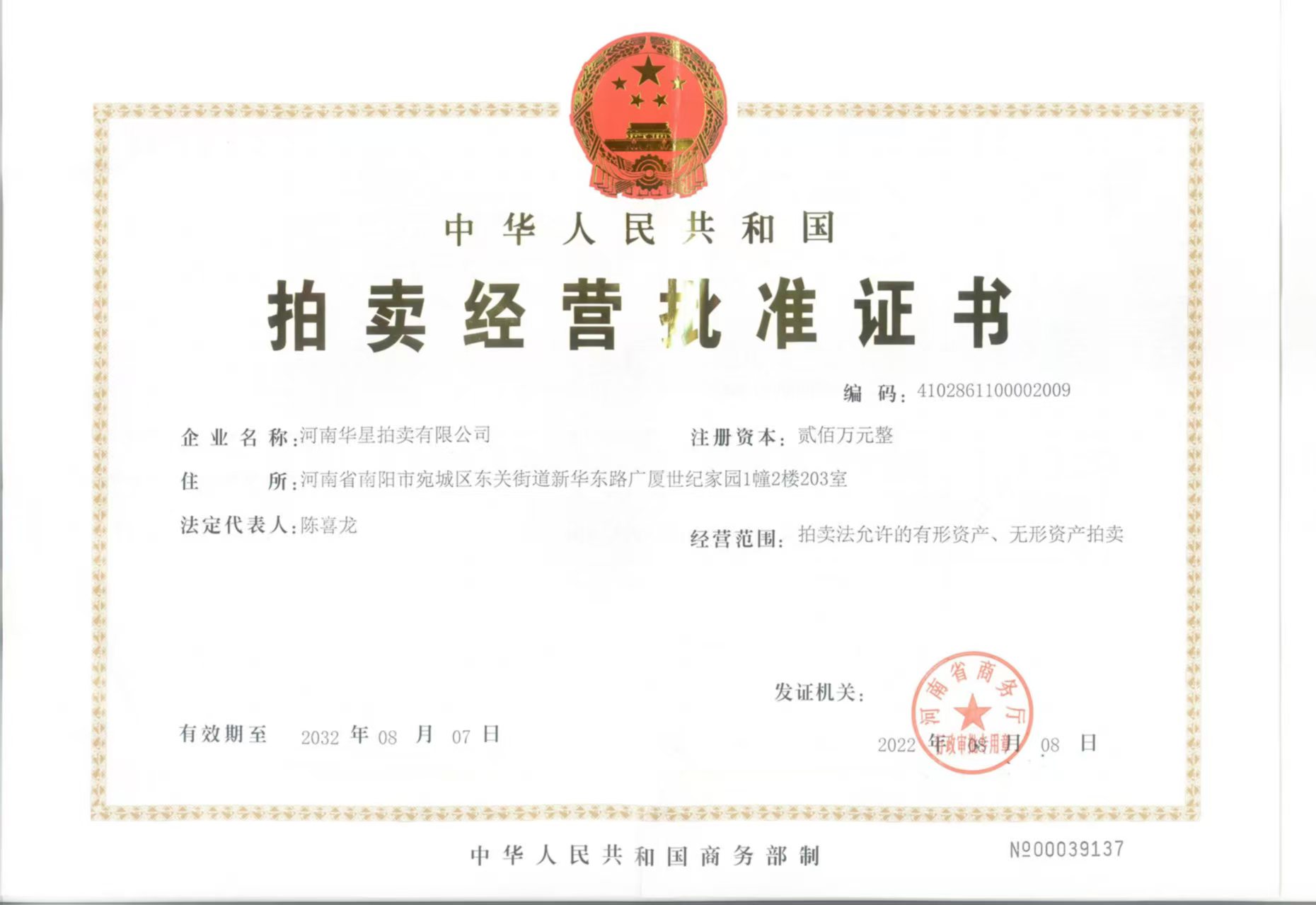 拍賣經營批準證書 |